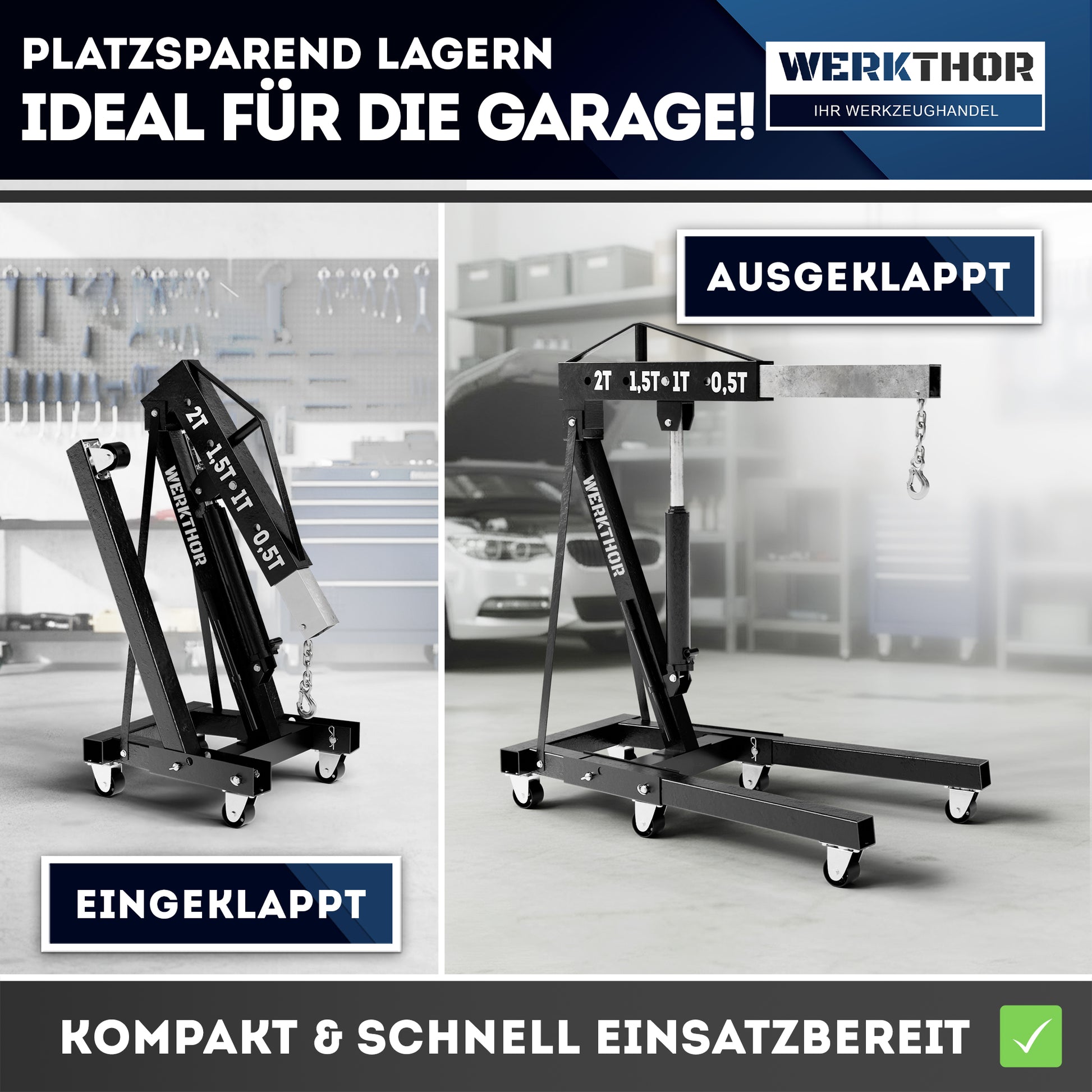 FLEXIBLE LEISTUNG IN 3 VARIANTEN – Der WERKTHOR Werkstattkran ist erhältlich mit 500 kg, 1000 kg oder 2000 kg Tragkraft und bietet die passende Lösung vom Hobby-Schrauber bis zur Profi-Werkstatt. Ideal zum Heben von Motoren, Getrieben oder schweren Bauteilen unterschiedlichster Fahrzeugklassen!